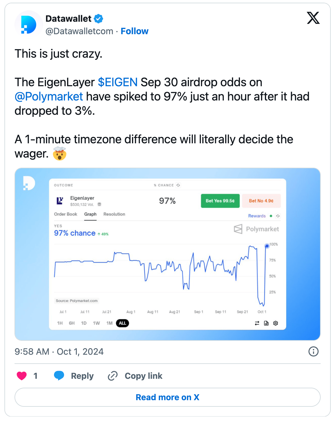 Polymarket Users Almost Lost Eigen Airdrop Bet by One Minute