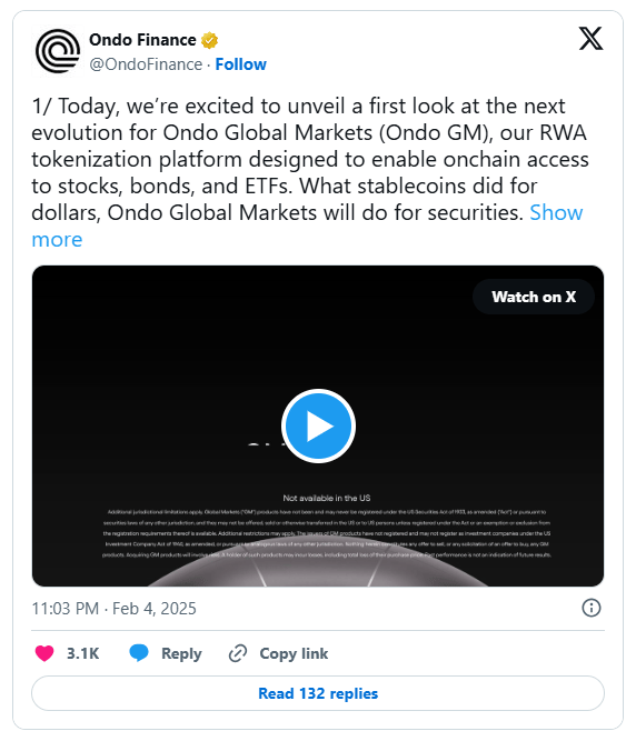 Ondo Finance has introduced Ondo Global Markets (Ondo GM), a new platform for tokenizing traditional assets like stocks, bonds, and ETFs to bring institutional-grade financial markets onchain. "What stablecoins did for dollars, Ondo Global Markets will do for securities," the company stated, highlighting its goal to finally bring ETFs and stocks to crypto.