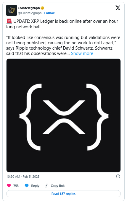 This halt, designed as a safety feature when validators can't reach consensus, sparked debate about XRPL’s centralization and resilience. “One possible failure mode for XRPL is if all the validators think something's wrong with the network, all refuse to send any validations,” Schwartz explained, adding that no user funds were at risk during the downtime.