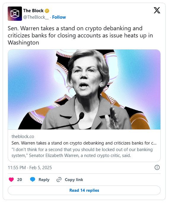 To everyone’s surprise, crypto critic Senator Elizabeth Warren pledged to work with President Donald Trump and Senate Republicans to stop the debanking of crypto firms. “Debanking is a real problem… You shouldn’t be locked out of our banking system” Warren said at a hearing.