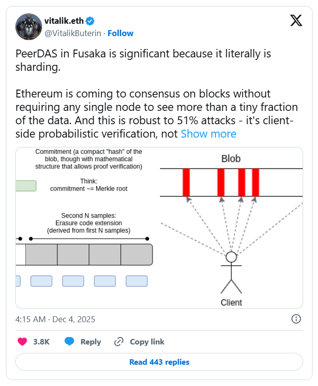 PeerDAS, the upgrade’s central feature, lets validators sample smaller data segments instead of downloading entire blobs, reducing bandwidth strain. Developers said this could expand blob capacity nearly eightfold and sharply lower Layer 2 rollup costs without affecting base-layer security.