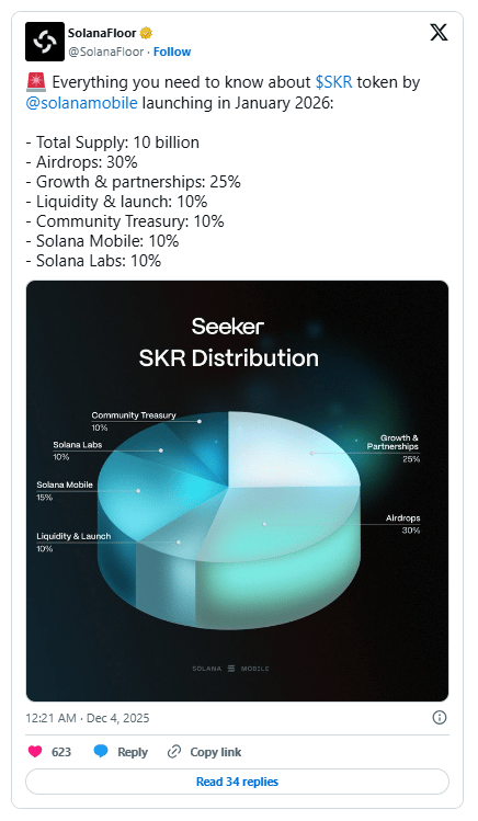 Solana Mobile said its native SKR token will officially launch in January 2026, expanding the Solana mobile ecosystem. The 10 billion supply token is designed to power ownership, incentives, governance, and user economics across the company’s Web3 handset network. About 30% of SKR’s total supply will unlock through an airdrop for Seeker owners and active decentralized app users.