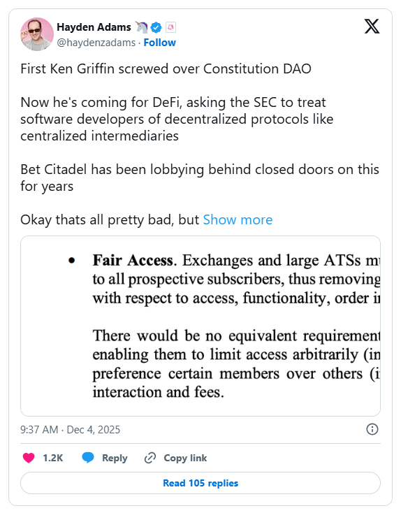 Crypto leaders and advocacy groups criticized Citadel’s stance as anti-innovation and harmful to open-source development. Blockchain Association CEO warned such regulation would drive developers offshore and undermine US competitiveness. Uniswap founder Hayden Adams called the comments “predictable,” accusing Citadel of protecting entrenched financial intermediaries against peer-to-peer technology.