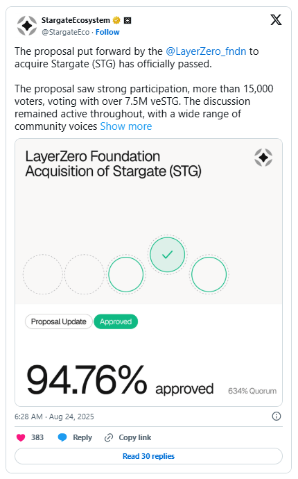 Stargate DAO has approved a $120 million acquisition offer from LayerZero Foundation, despite last-minute rival bids from Wormhole, Axelar, and Across. Nearly 95% of voters backed the deal after LayerZero amended terms to compensate veSTG holders with six months of bridge revenue. Under the agreement, the DAO will dissolve and STG holders will swap tokens for ZRO at a fixed ratio.