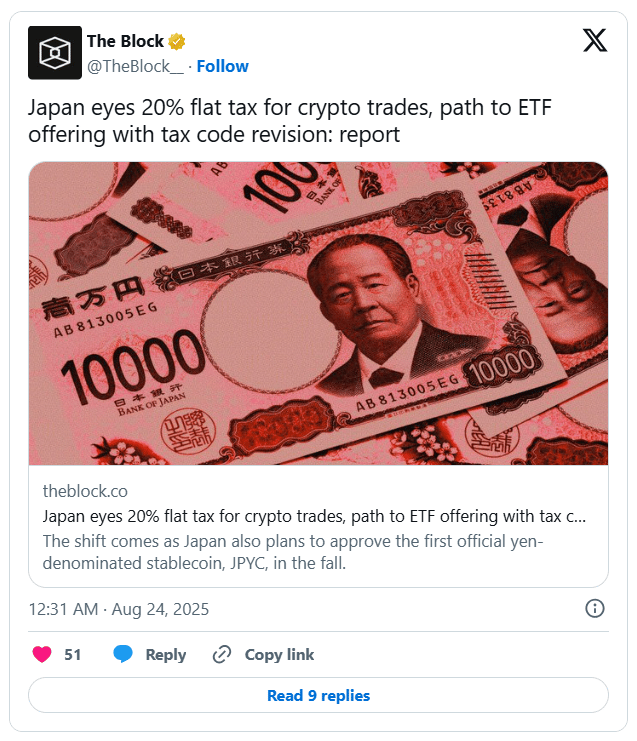 Japan’s Financial Services Agency will propose a tax code revision for 2026 that places crypto gains into a new bracket with a flat 20% tax. Currently, crypto income is classified as “miscellaneous” and taxed at progressive rates up to 55%, making it far costlier than stock gains. The plan also includes a three-year loss carry-forward.