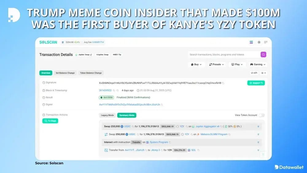 The first buyer of Kanye West’s new YZY token was a trader known as “Naseem,” who spent $250,000 USDC to secure 1.2 million tokens. Bubblemaps analysis shows the wallet quickly sold a portion for $535,000 and cycled liquidity through a Meteora pool to net $1.02 million. Naseem previously made $100 million trading Donald Trump’s TRUMP meme coin.