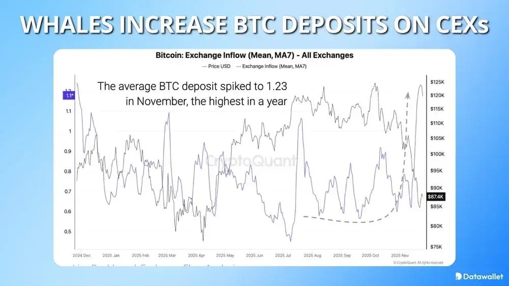 CryptoQuant reported a surge in large Bitcoin deposits following the recent price decline toward eighty thousand. Analysts said average deposit size rose significantly, implying whales transferred substantial holdings onto centralized venues. These inflows indicated heightened selling pressure as major traders continued reducing risk exposure across markets.