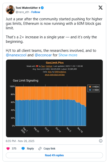 Vitalik Buterin said the higher limit fits a shift toward selective optimization where future increases may coincide with steeper costs for heavy operations. He added that this approach preserves efficiency as blocks grow while still enabling expanded throughput across Ethereum’s primary network.
