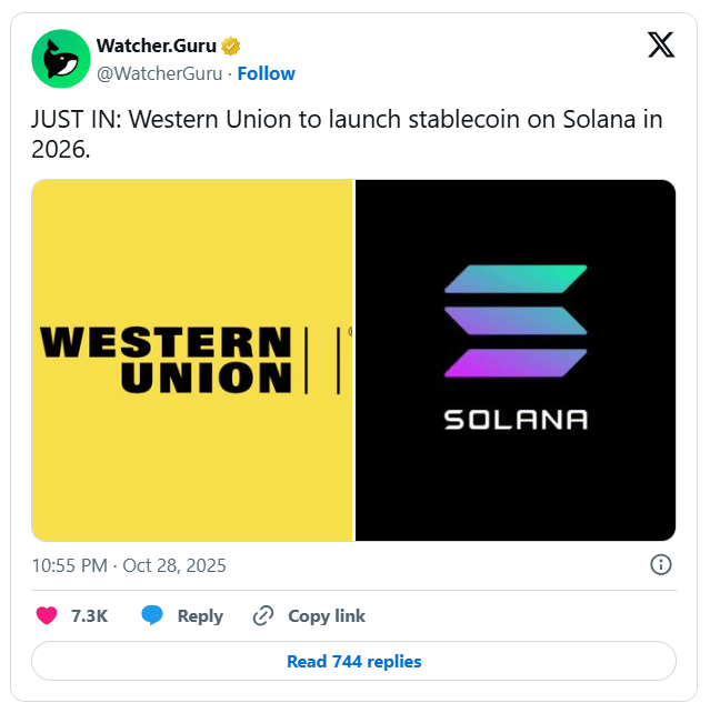 Western Union will release a dollar-pegged stablecoin called USDPT through the Solana blockchain network in early 2026. The firm said Anchorage Digital Bank will issue the token, enabling users to send, receive, and store funds seamlessly. Executives added that the project aligns with Western Union’s broader mission to expand financial access through blockchain-based global remittance systems.
