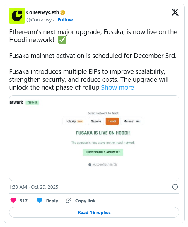 GM. Ethereum’s Fusaka upgrade hit its final testnet, setting the stage for a December 3 mainnet launch with major scalability and security boosts.