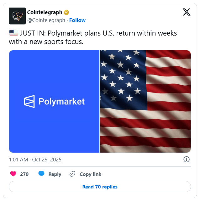 Prediction platform Polymarket plans to reopen to American users by late November, according to Bloomberg sources. The return follows its 2022 enforcement settlement with US regulators and the acquisition of licensed exchange QCX. Executives said the relaunch establishes the firm as a federally compliant operator within the fast-growing event trading sector.