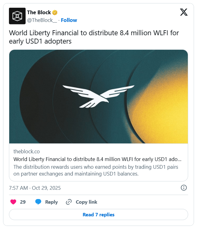 World Liberty Financial will distribute 8.4 million WLFI governance tokens to users who joined its USD1 stablecoin rewards program. The campaign, launched two months ago, incentivized users for trading USD1 pairs and maintaining token balances on partner exchanges. Company officials said the initiative strengthens community engagement and supports the platform’s long-term decentralization goals.