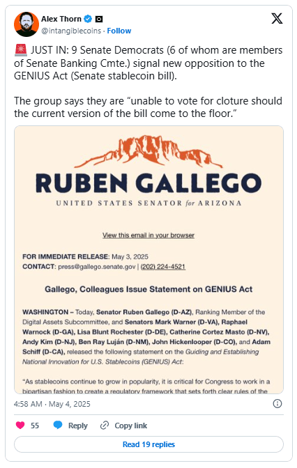 Nine U.S. Senate Democrats said they no longer support the GENIUS Act stablecoin bill without changes, citing national security and AML concerns. Their statement, issued just days before a planned floor vote, surprised colleagues, as four of the signers had previously voted to advance the bill out of committee. The act would impose strict reserve and disclosure rules on stablecoin issuers.