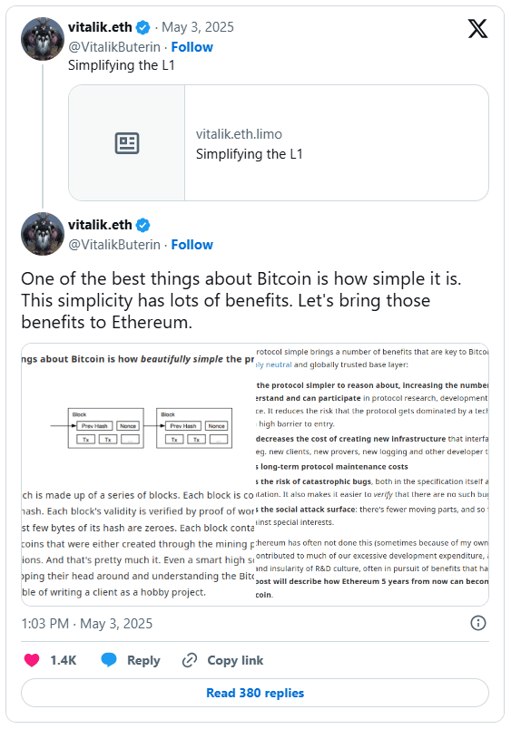 Ethereum co-founder Vitalik Buterin published a blog post on May 3 proposing protocol-wide simplification to make Ethereum more like Bitcoin in design. He criticized past complexity (blaming even his own decisions) for inflated development timelines, higher bug risks, and closed-off research culture. Changes include streamlining consensus to “3-slot finality” and transitioning execution to a ZK-friendly, RISC-V virtual machine.