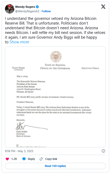 Arizona Governor Vetoes Bitcoin Reserve Bill