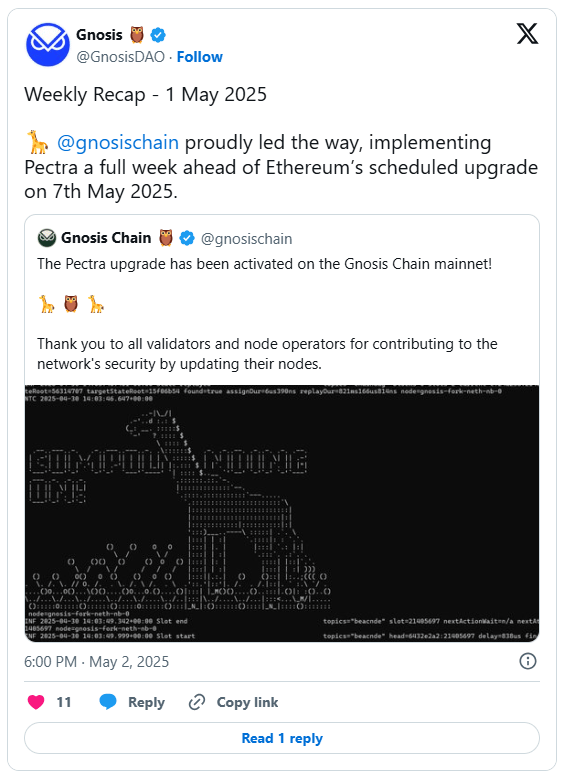 Gnosis Chain has successfully deployed Ethereum’s Pectra upgrade ahead of its scheduled May 7 mainnet release. The milestone upgrade integrates 11 Ethereum Improvement Proposals and marks the biggest protocol overhaul since 2024’s Dencun.