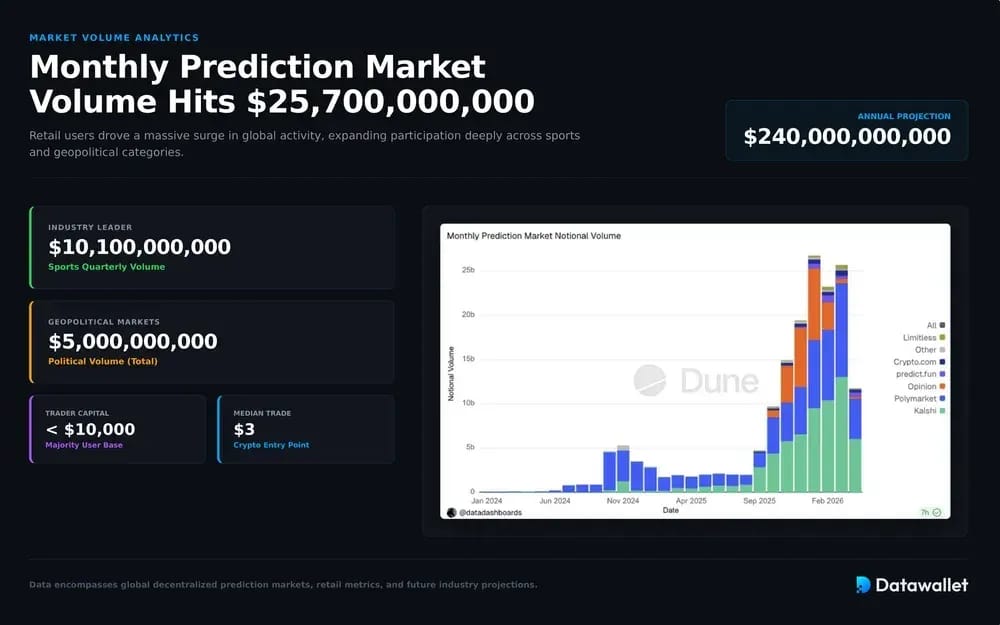 Global prediction market volume reached $25.7 billion last month as retail users drove a surge in activity. A new report indicates that most traders operate with less than $10,000 while returning more frequently to the platforms. Participation grew across sports and geopolitics as category engagement deeply expanded.