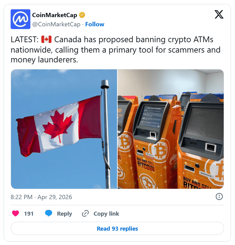The measure would still allow in-person crypto purchases through staffed money-services businesses, where employees can manage compliance and monitor suspicious activity. Ottawa cited FINTRAC’s recent enforcement against 84 money-services businesses as part of a wider fraud crackdown. The proposal mirrors similar moves already taken in Indiana, Tennessee, and New Zealand.