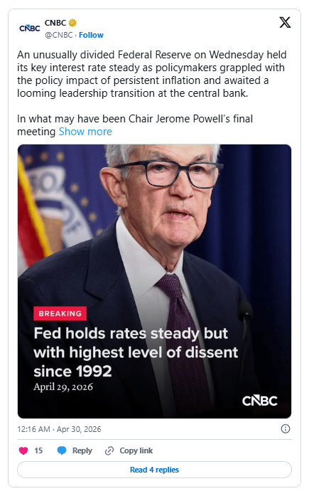 That overlap gave the meeting an unmistakable handoff atmosphere. Jerome Powell’s term as chair ends on May 15, making this likely his last policy meeting in command, while Warsh’s 13-11 committee vote pushed his nomination toward the full Senate and a probable June debut atop the central bank.