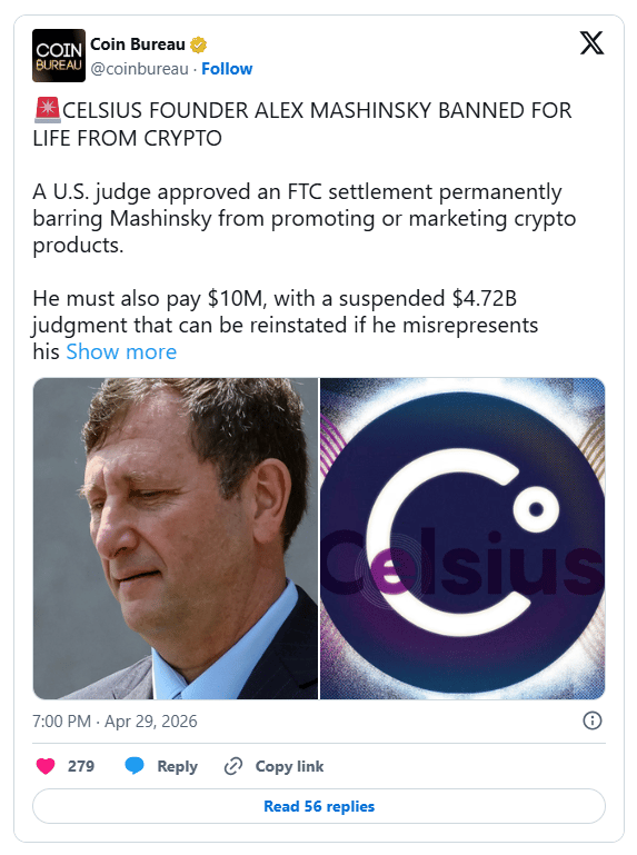 The settlement stems from FTC accusations that Mashinsky and other Celsius executives used deceptive marketing to sell lending and custody services before the platform collapsed in 2022. The order also imposes long-term reporting duties. Mashinsky is already serving a 12-year prison sentence after pleading guilty to fraud and token manipulation.