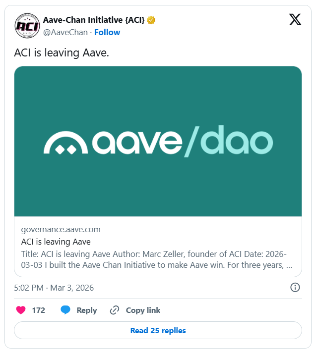Aave Delegate ACI Winds Down After Funding Vote