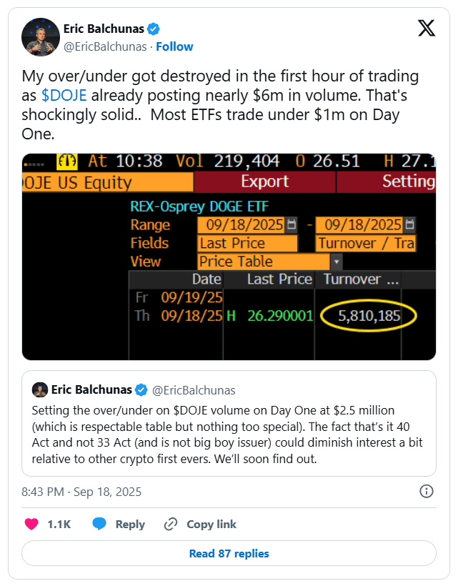 Trading volume for DOJE reached nearly $6 million within the first hour, far exceeding Bloomberg analyst Eric Balchunas’ $2.5 million projection. By comparison, most ETFs record under $1 million on debut day, making DOJE’s initial momentum unusually strong.
