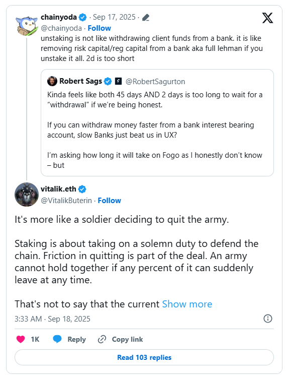 Ethereum founder Vitalik Buterin defended the network’s lengthy staking exit times, which critics argue reduce usability for participants. He said staking requires responsibility, comparing leaving to “a soldier quitting the army” and stressing friction maintains stability. Exit times currently exceed 43 days, while more than one million validators have staked 35.6 million ETH.