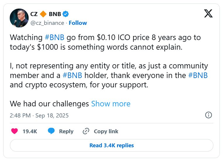 Analysts said further momentum depends on clearer Fed guidance, with risks of reversal if policy expectations shift unexpectedly. ETF inflows slowed, with US Bitcoin funds recording outflows while Ethereum remained flat. Binance co-founder Changpeng Zhao celebrated BNB’s milestone, thanking supporters and emphasizing community resilience since the project’s launch eight years ago.