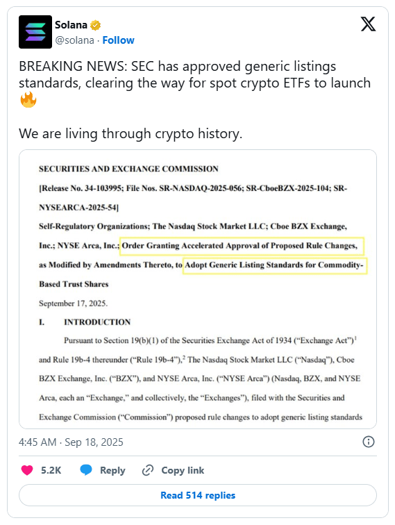 The US Securities and Exchange Commission approved new standards expediting the listing of crypto ETFs on major exchanges. The rules allow eligible products to list without lengthy 19b-4 filings, reducing timelines from 240 to 75 days. SEC Chairman Paul Atkins said the decision fosters innovation and investor choice, while preserving safeguards in regulated markets.