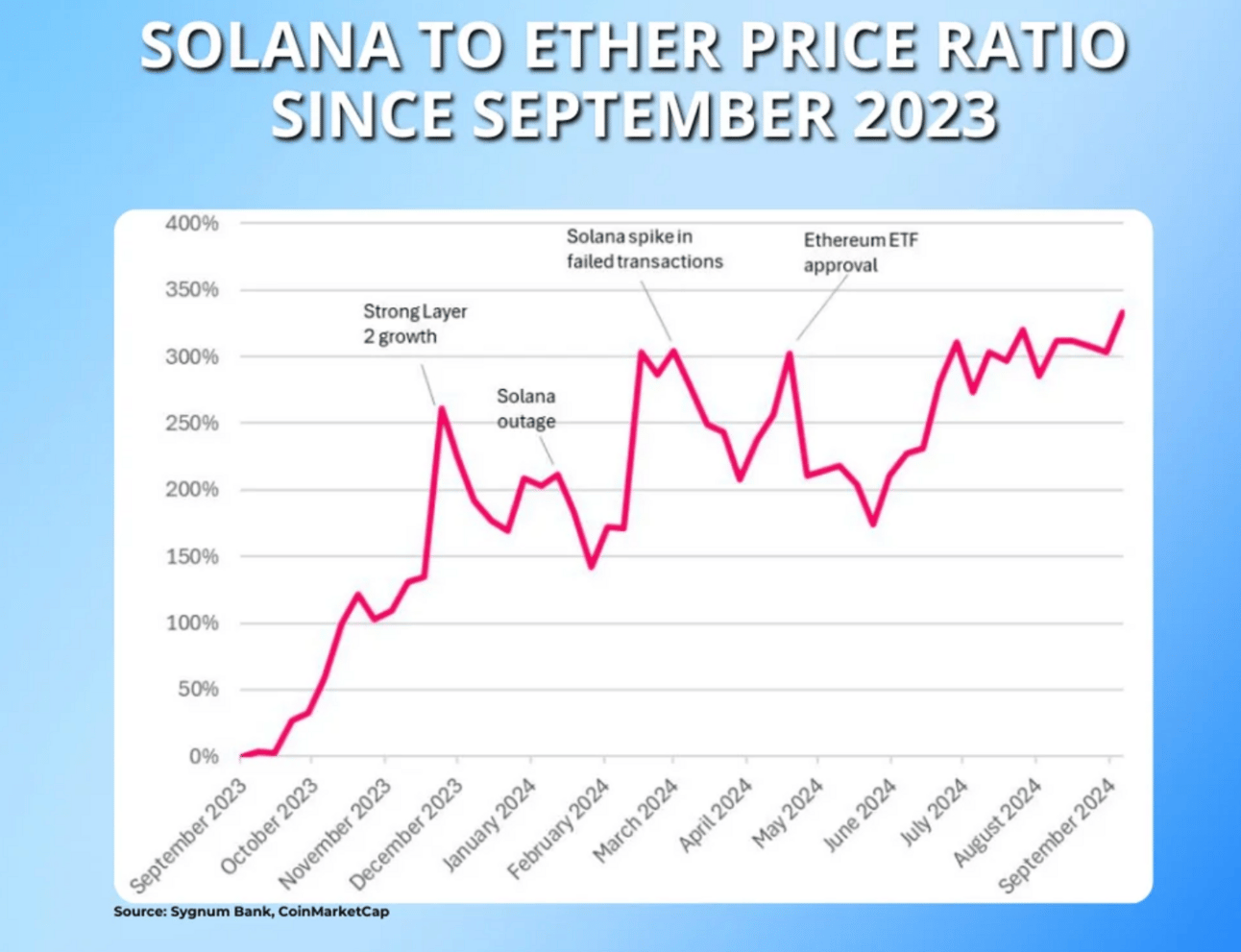 A report by Sygnum suggests that Solana is the top challenger to Ethereum due to its scalability, as major financial institutions like PayPal, Visa, and Franklin Templeton integrate it into their platforms. However, Ethereum's 81% market share and Solana's reliance on meme coin trading remain challenges.