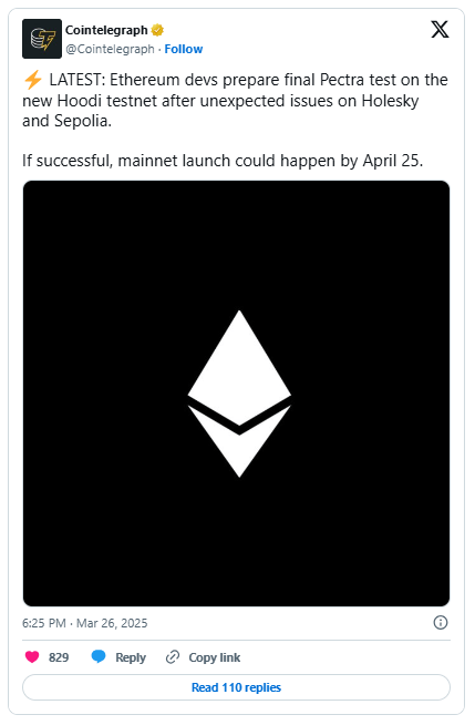 Ethereum developers launched the final test of the Pectra upgrade on the newly created Hoodi testnet after earlier failures on Holesky and Sepolia. The Pectra upgrade includes changes to user experience and smart wallet capabilities such as paying fees in tokens other than ETH. Devs plan to activate Pectra on Ethereum’s mainnet roughly 30 days from Wednesday if the Hoodi test proceeds without major issues.