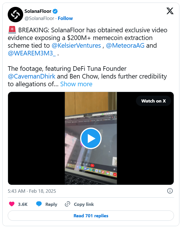 Ben Chow, co-founder of Meteora (a decentralized exchange on Solana), has resigned following allegations of insider trading related to the collapse of LIBRA token, which lost over 90% of its value hours after launch. The fallout has drawn scrutiny over suspicious wallet activity, with on-chain analysts linking insiders to the sell-off at LIBRA’s peak market cap of $4 billion.