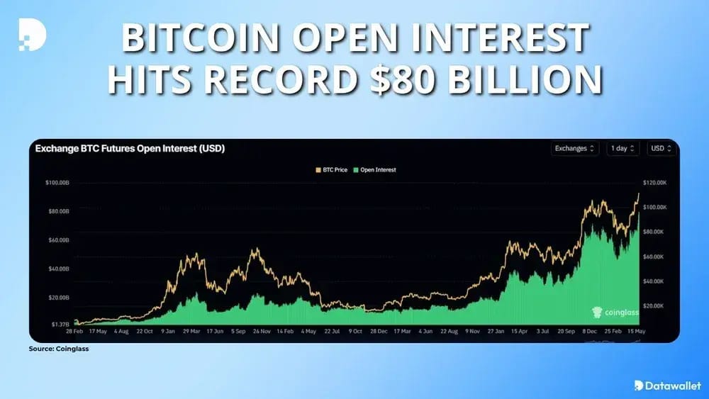 Bitcoin futures open interest surged to a record $80 billion on May 23, rising 30% since the beginning of the month, per CoinGlass data. Traders have taken on massive leveraged positions anticipating a breakout above $111,000, despite increased market volatility. Analysts say the inflows into U.S. spot Bitcoin ETFs, now over $2.5 billion, may help offset downside risks.