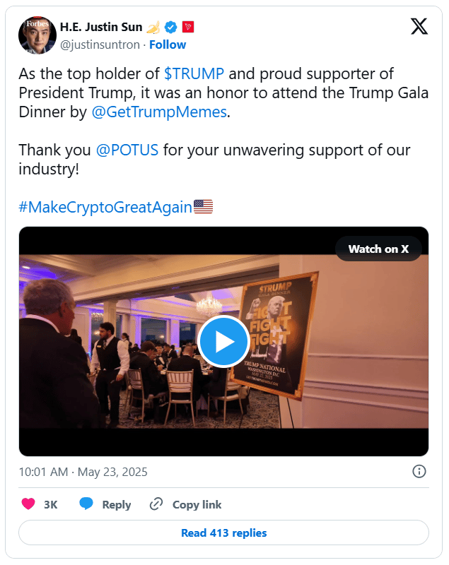 Sun, who faces past SEC charges, was brought on stage and gifted a $100,000 Trump-branded gold watch at the event. Protesters gathered outside with signs reading “Crypto Grift Dinner” and “Democracy Is Not For Sale,” calling for financial ethics reform. Trump-linked entities have reportedly earned over $100 million from TRUMP token trading since the start of his 2025 campaign.