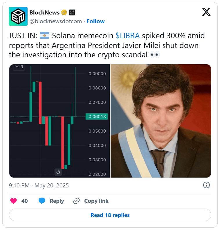 Argentina’s government abruptly dissolved a task force investigating the LIBRA memecoin scandal just days after a judge ordered the president’s bank records unsealed. President Javier Milei and his sister had promoted the Solana token before its collapse, prompting allegations of improper influence and insider gain. The meme coin briefly reached a $2 billion market cap before crashing more than 90% in value.