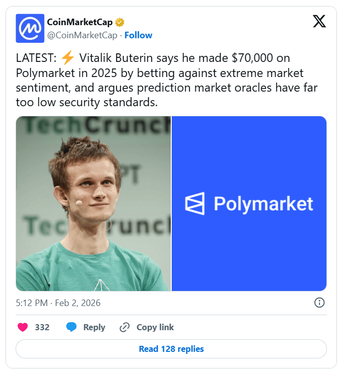Vitalik Buterin Profited $70,000 From Polymarket Trading