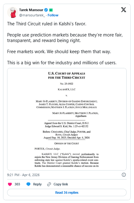 GM. Kalshi won a major appeals court victory today after a 2-1 ruling blocked New Jersey from banning its sports prediction markets, affirming federal CFTC oversight.