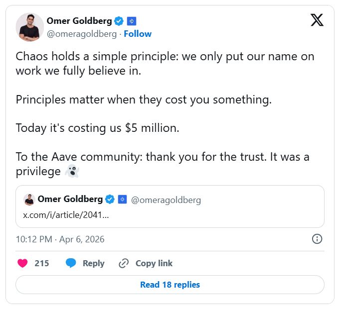 Prominent risk manager Chaos Labs announced its departure from the Aave ecosystem Monday following a major disagreement over the upcoming V4 upgrade strategy. The firm managed the protocol for 2 years while helping it grow to $26 billion without any material bad debt. Leadership cited a fundamental deep misalignment.