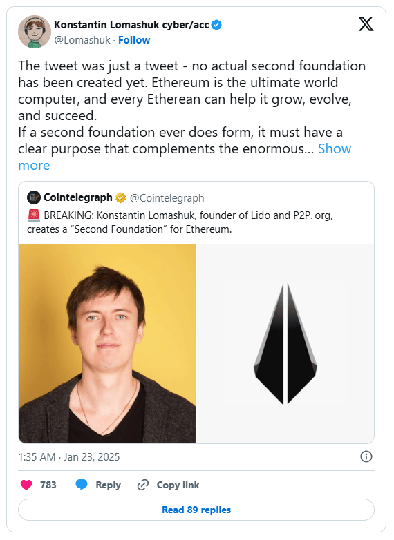 Konstantin Lomashuk, co-founder of Lido, addressed rumors surrounding the creation of a "Second Foundation" within the Ethereum ecosystem. In a post on X, Lomashuk clarified, "The tweet was just a tweet - no actual second foundation has been created yet," dismissing speculation he was involved in forming the rumored organization.