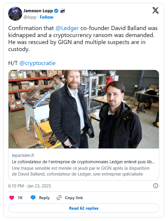 Balland, who co-founded Ledger in 2014, was previously the director of the company’s Vierzon factory, where the firm manufactures physical crypto wallets. Ledger, valued at €1.3 billion ($1.4 billion) following a €100 million ($104 million) funding round in 2023, employs around 700 people and is headquartered in Paris. After his release, Balland was placed in the care of emergency services.