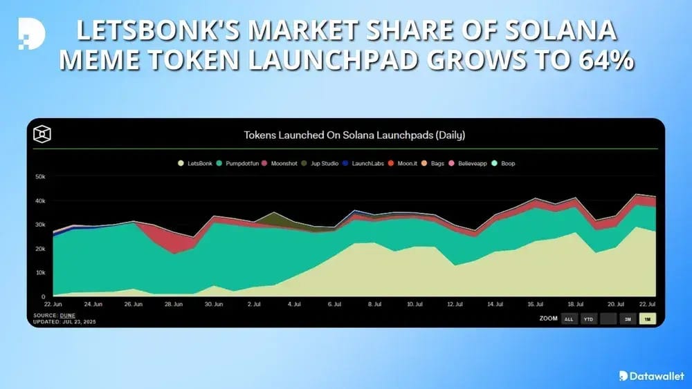 Solana's platform LetsBonk has captured 64% of meme token launches, dominating the space after onboarding over 150,000 tokens last week. The platform saw a record 26,600 launches in a single day on July 18, more than doubling volumes from rival PumpFun. BONK, LetsBonk’s native token, has surged nearly 200% over the last month, outperforming most of the Solana ecosystem.