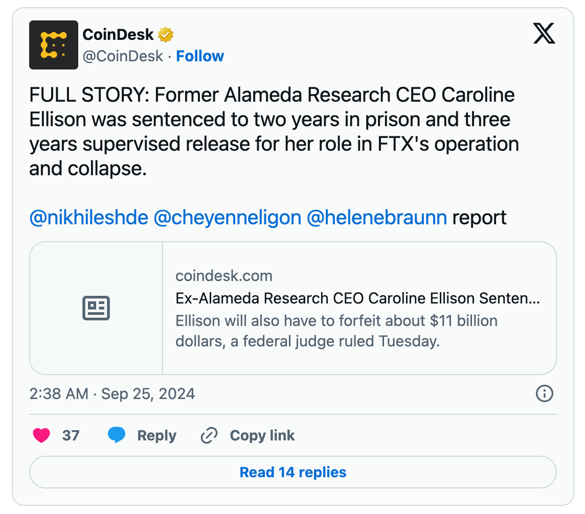 Caroline Ellison, former co-CEO of Alameda Research, received a two-year sentence for her role in the collapse of FTX, having pled guilty to multiple fraud charges. Ellison admitted that former FTX CEO Sam Bankman-Fried directed her to commit the crimes that led to the downfall of the exchange. She expressed deep regret during her sentencing, apologizing to those affected by FTX’s implosion.