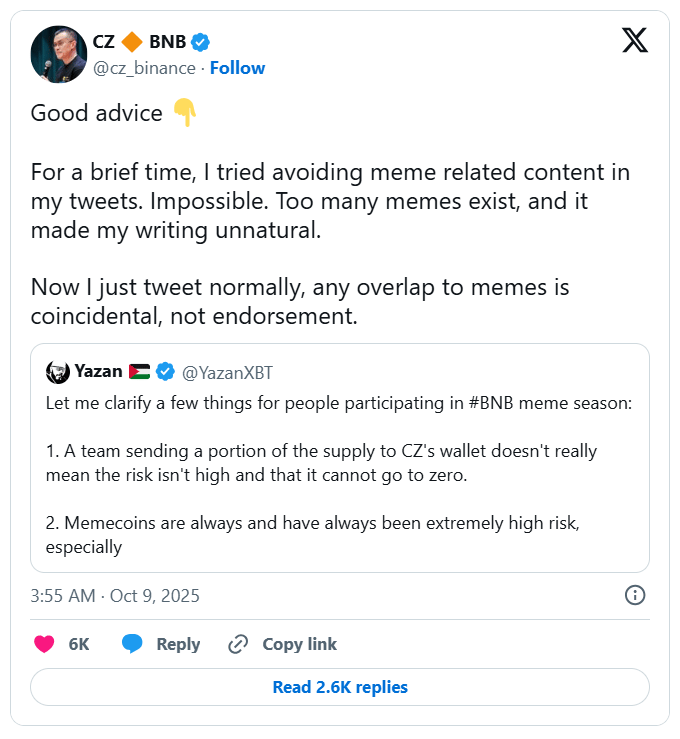 BNB Meme Tokens Crash After CZ Denying Endorsement