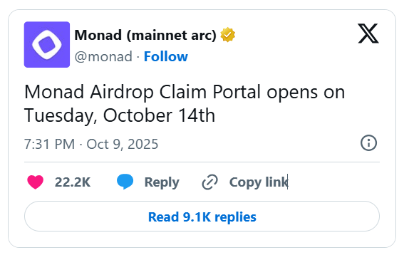 Monad, the high-performance Layer 1 blockchain, confirmed its long-awaited token airdrop will begin next week, setting Oct. 14 as launch day. The announcement arrived through an X post, intensifying speculation across crypto circles already bracing for the network’s long-promised debut.