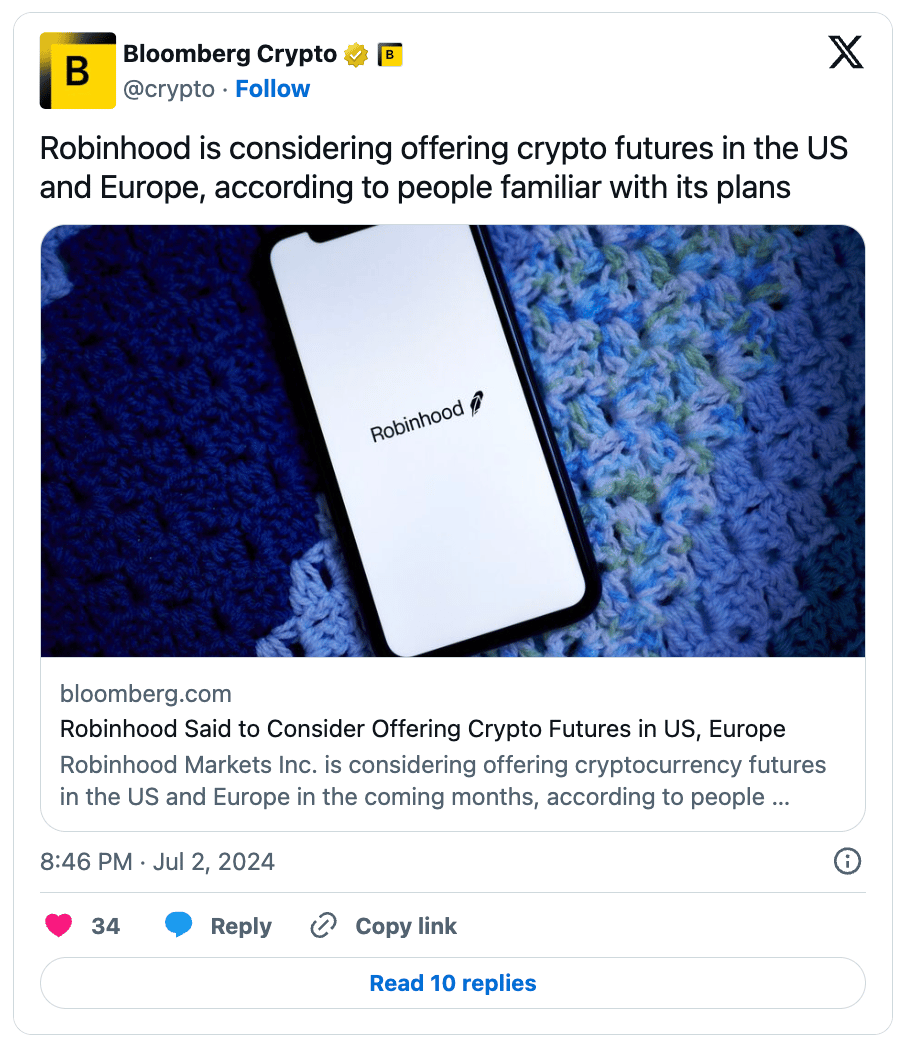 Robinhood is planning to launch CME-based Bitcoin and Ether futures in the US and aims to offer perpetual futures for BTC and other tokens in Europe using licenses from its impending Bitstamp acquisition. The $200 million takeover of Bitstamp, expected to close in the H1 of 2025, would expand Robinhood's reach to Bitstamp's retail and institutional clients across multiple regions.