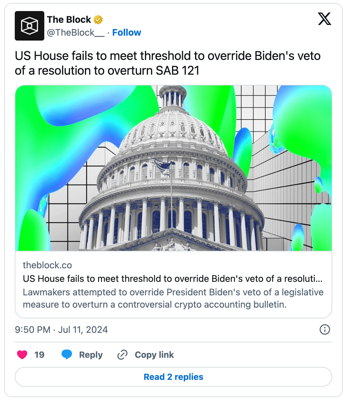 US lawmakers failed to override President Biden's veto of a measure to overturn the crypto accounting bulletin SAB 121, falling short of the two-thirds majority needed in the House with a vote of 228-184. The bulletin requires firms that custody crypto to record customer holdings as liabilities, a rule criticized for potentially hindering banks from safeguarding digital assets.