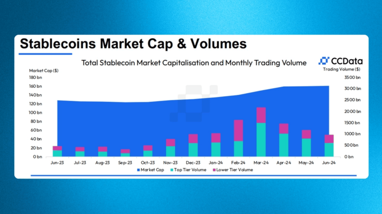 According to a report by CCData, the total market capitalization of the stablecoin sector increased by 0.53% in June to reach $161 billion, marking its highest level since April 2022 after nine consecutive months of growth. Despite this rise, the growth rate has decelerated since May, aligning with a downtrend in digital asset markets and reduced capital inflows.