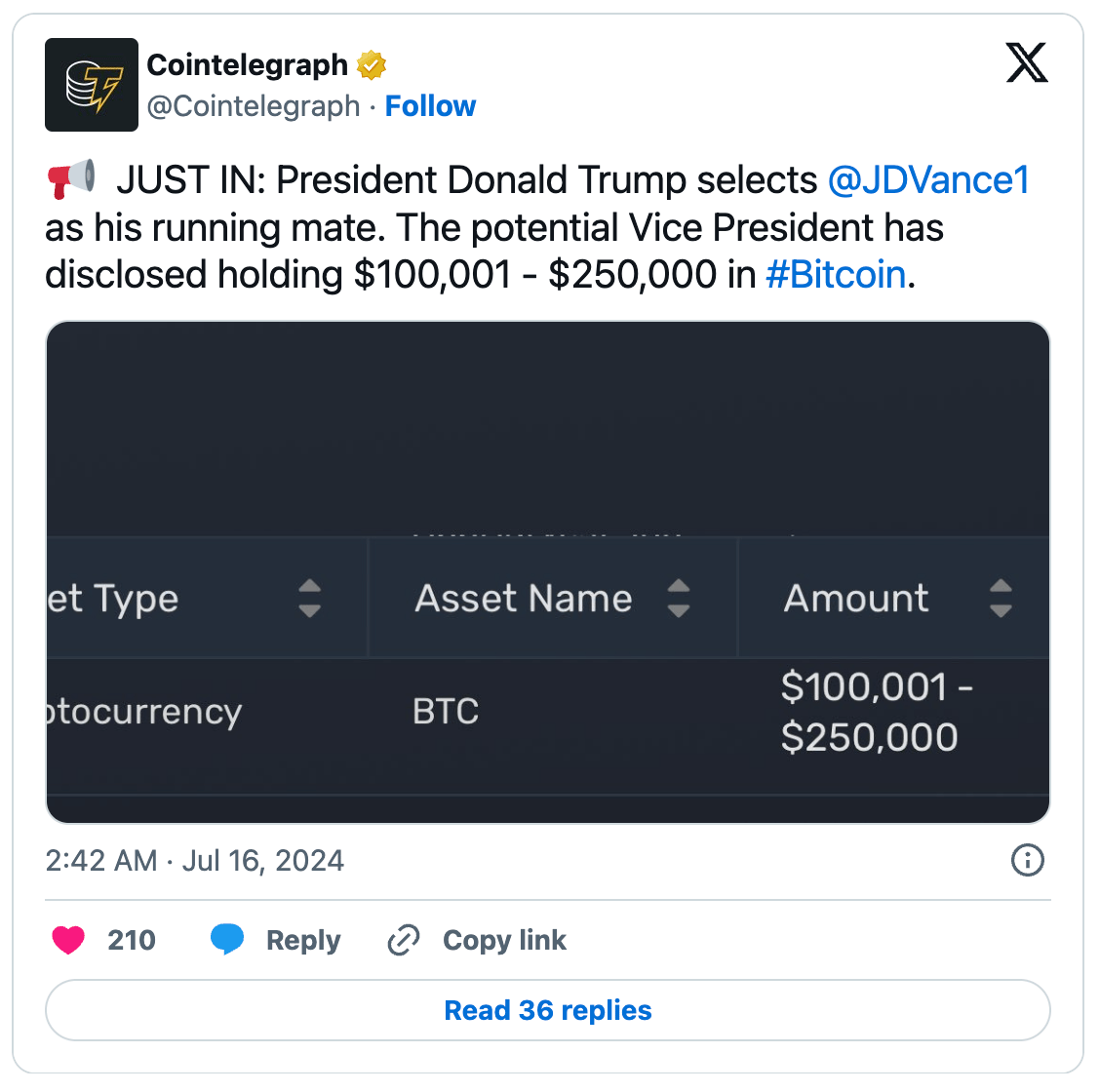 Trump Picks Crypto-Friendly JD Vance as Running Mate