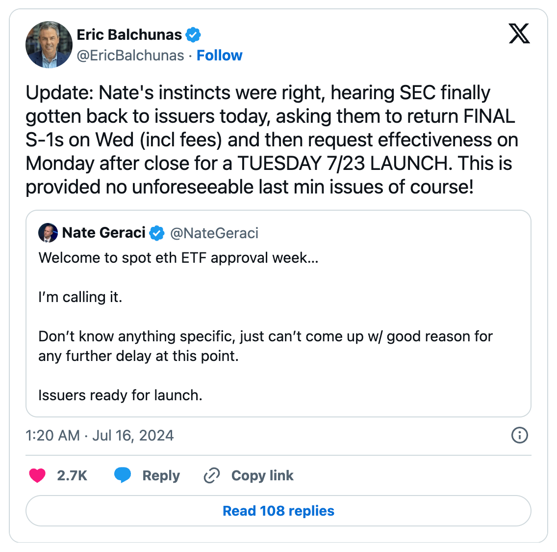 Spot Ethereum ETFs are expected to start trading on Tuesday, July 23, following confirmation from multiple sources, including a social media post by Bloomberg Senior ETF Analyst Eric Balchunas. He noted that the SEC had requested final S-1 filings from issuers, to be submitted by Wednesday evening, with approval likely by Monday for a Tuesday launch.