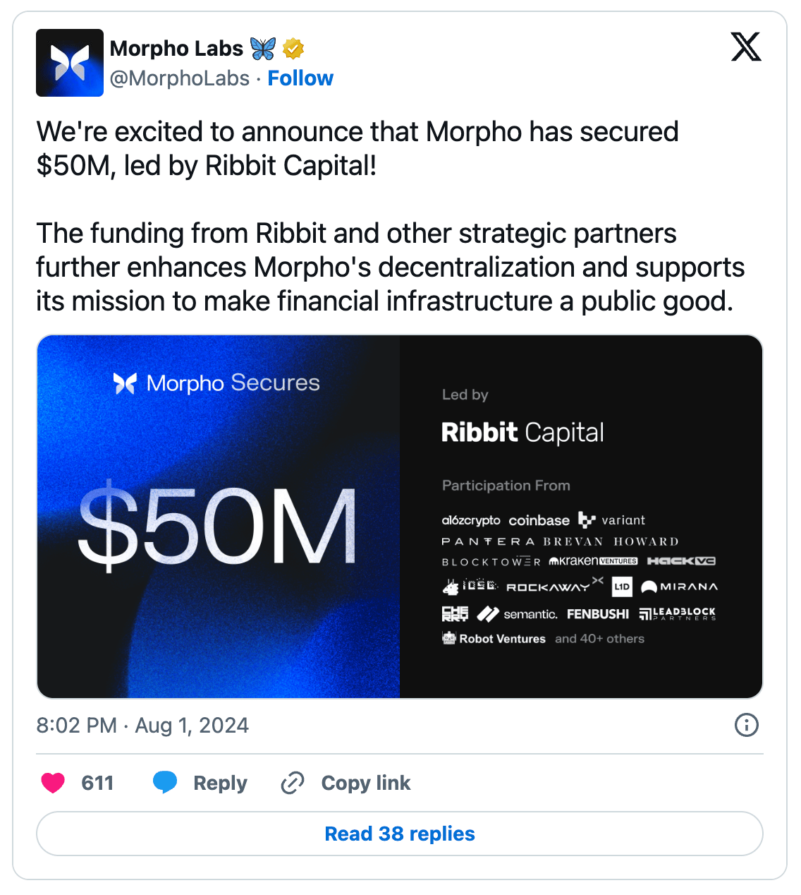 Morpho Raises $50 Million from Ribbit Capital, a16z, Coinbase